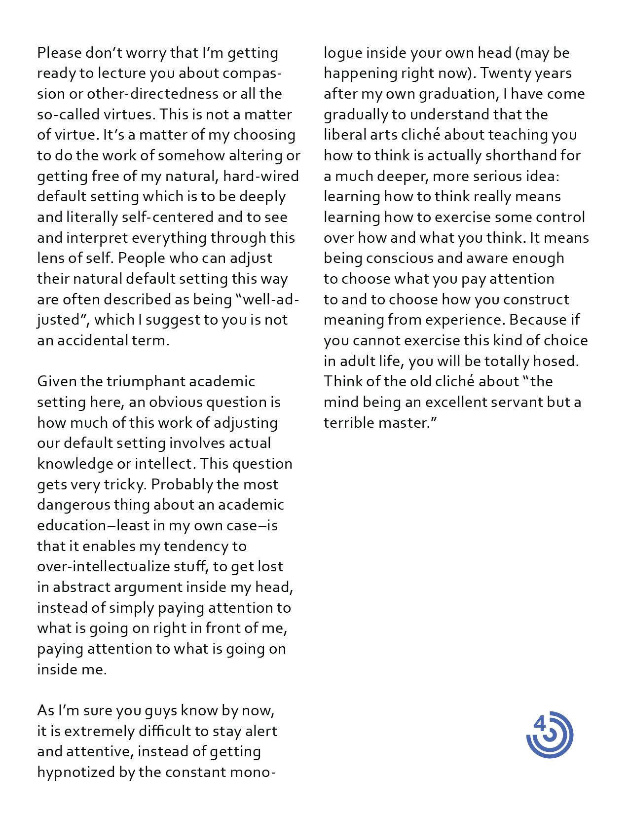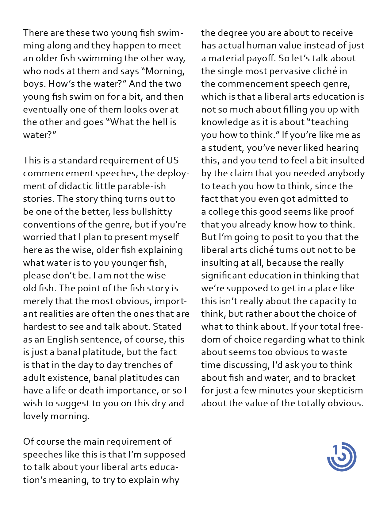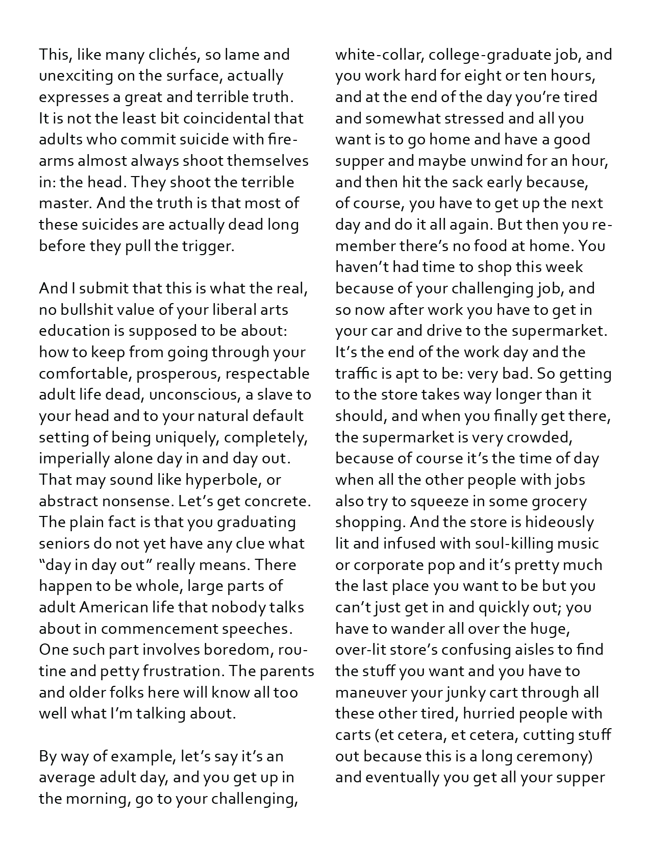 4.25" x 5.5" Printed Booklet Graphics designed in Adobe Illustrator Layout and copy designed in Adobe InDesign Original speech by David Foster Wallace Design and assembly by Mats Hoerenz