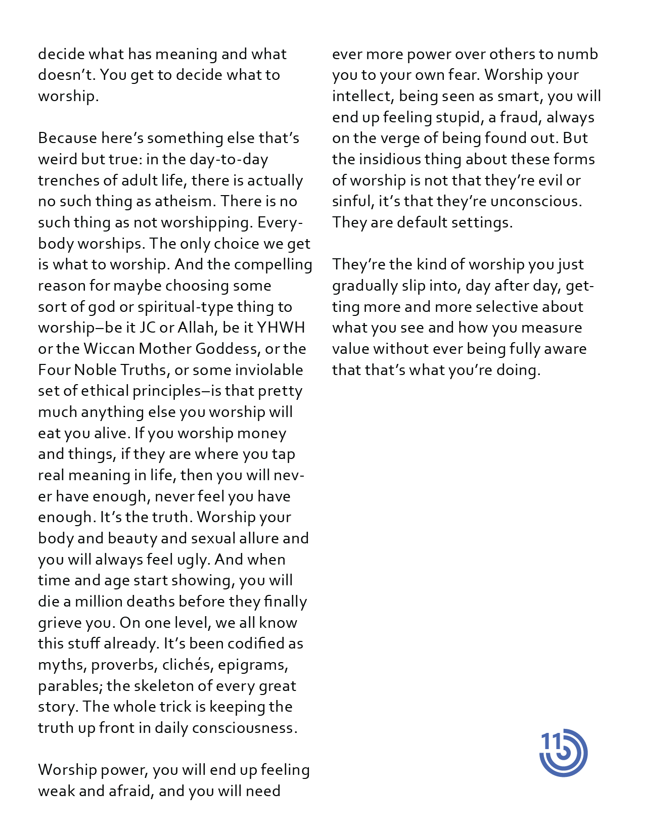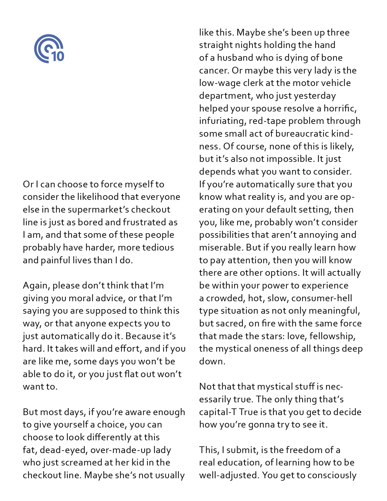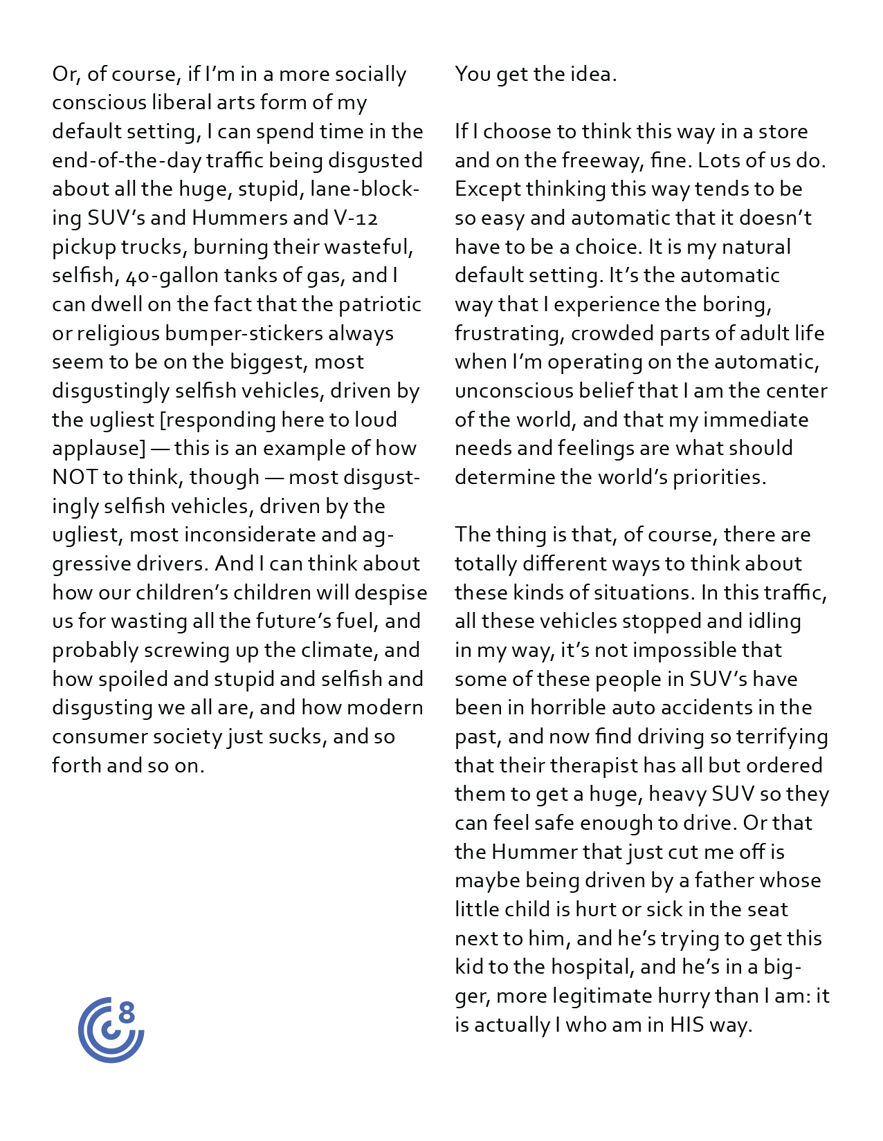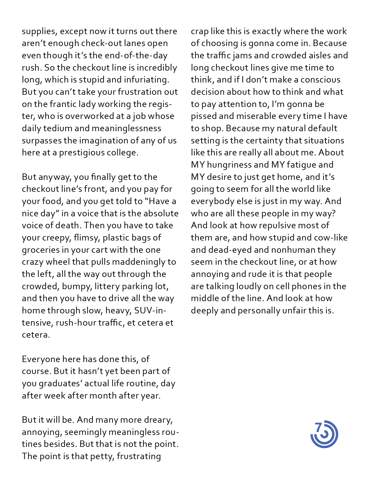 4.25" x 5.5" Printed Booklet Graphics designed in Adobe Illustrator Layout and copy designed in Adobe InDesign Original speech by David Foster Wallace Design and assembly by Mats Hoerenz